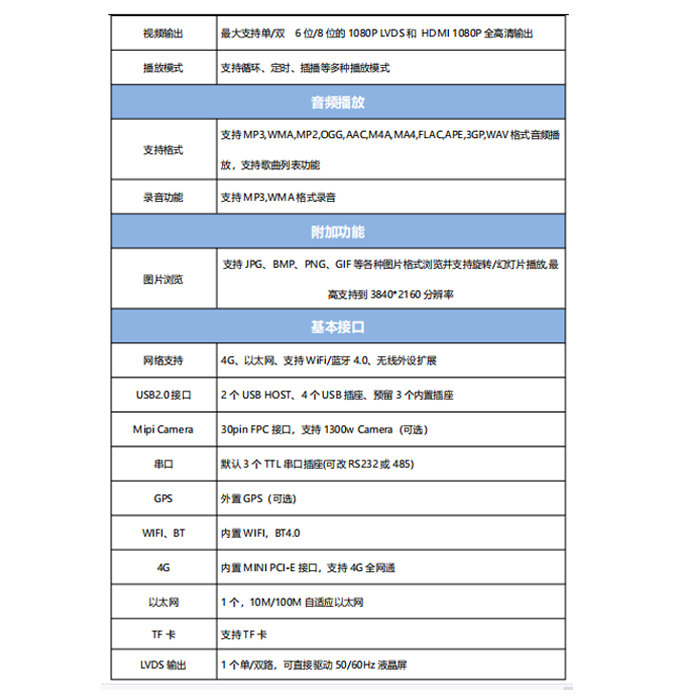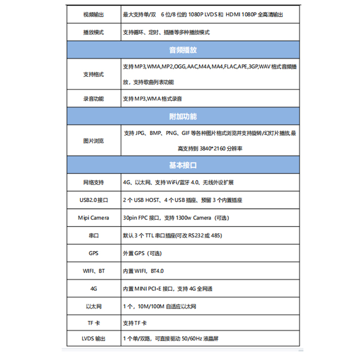 高清晰度:最大支持 3840×2160 的解码和各种 LVDS/EDP 接口的 LCD 显示屏.功能齐全:支持横竖屏播放,视频分屏,滚 动字幕,定时开关,USB 数据导入等功能。