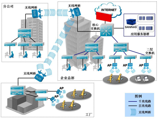 随着我国企业信息化的推进,很多企业的信息化发展经历了从早期的简单办公网、生产网信息化过渡到综合接入网、综合管理网、综合应用网,越来越多的企业部门、区域要求联网进行资源共享与整合。而企业能提供的网络资源却越来越难以满足这样高速发展的需求。过去以集线器、低端交换机为交换骨干、以文本数据交换为主要内容的初期企业网络,已逐渐向高带宽、智能化、强管理、可运营、高度灵活性为主要特征的新一代企业网络模式迈进。企业的内部网络以及总部与分支之间的互联互通变得频繁起来,网上传输的数据种类呈现多元化发展,文本信息、视频数据、语音信息等为代表的数据需求逐步凸现出来。企业员工对于随时随地灵活访问网络,不受空间所局限的需求越来越凸现出来。比如:在各种会议中的网络访问无法进行,外来访客或临时工作人员无法快速获得网络资源,厂房等生产区域的有线网络部署无法实现,企业园区视频监控因有线网络资源不足而无法实施,等等。