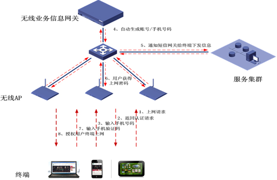 1、无线接入终端采用PORTAL方式,推送WEB页面,将用户强制引导至指定网页(企业活动宣传、接入认证),并对智能手机、平板电脑、笔记本电脑分别推送不同的内容;